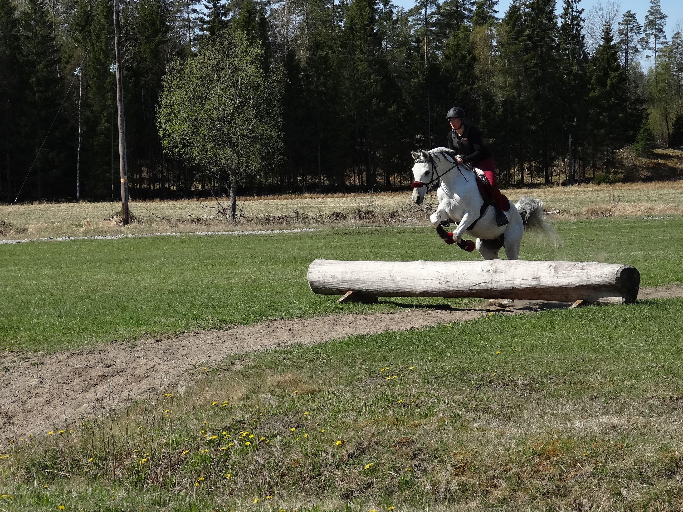 We moved on to the bank. A bank is a fence you jump either up or down, or in our case, first up and then down. Jumping a bank really challenges your instincts as you have to do the opposite of what you really want to do. When you jump up on the bank you need to keep the contact with the horse's mouth through the reins even though instinct tells you to let go. If you let go of the reins the horse will fall into the fence. Once on the bank all you want to do is hold on really hard as the horse jumps down from it, but what you should do is to give the horse a bit longer reins and just relax your hands.