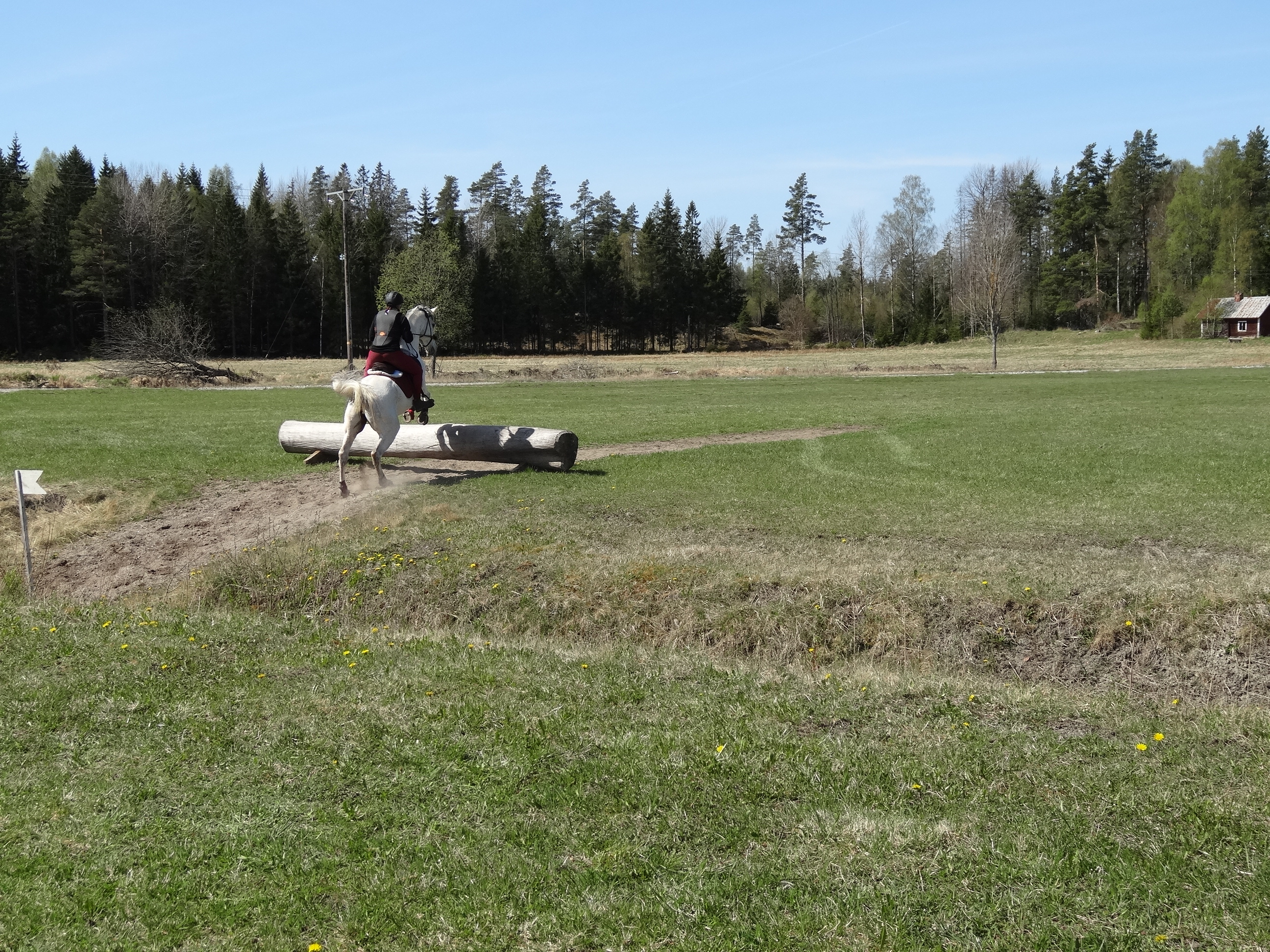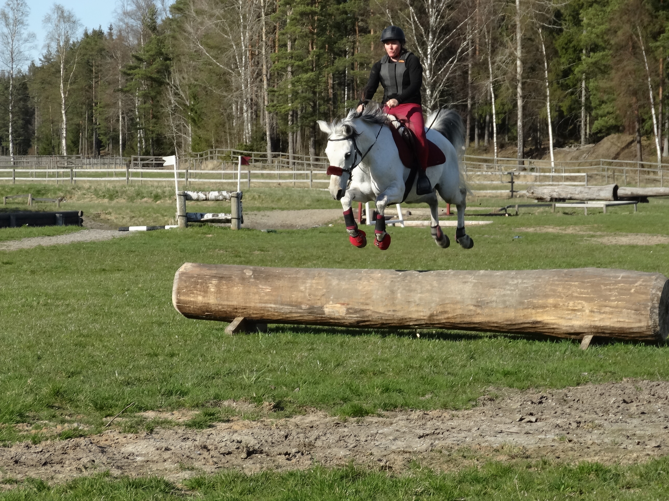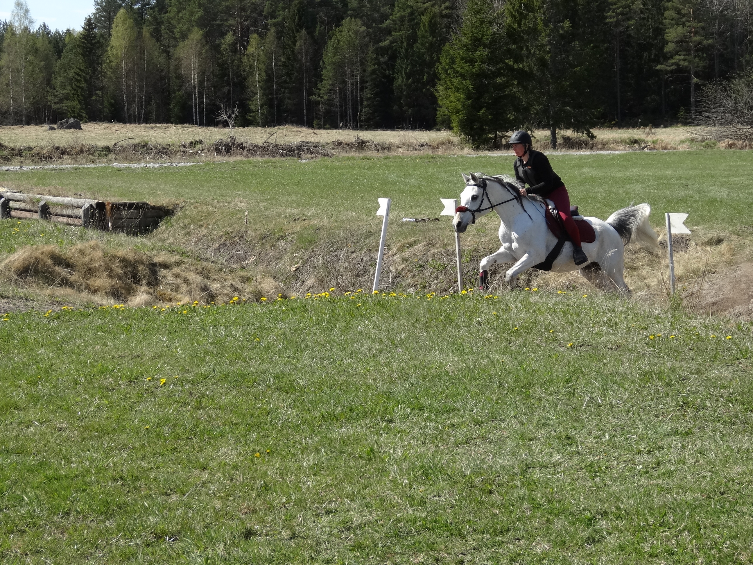 We jumped the log and the house a couple of times and then we moved on to another log and a bench after which we moved on to the ditches. The first ditch was about 30 cm wide and about equally deep. We started walking over it, and when that worked we moved on to trot and later canter. Nemah jumped really well over the ditch. As a last exercise we jumped a log placed over the ditch. Again, not a problem, probably because the horses and riders had gotten used to the ditch gradually.